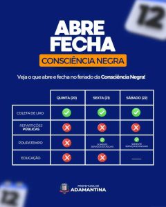 De acordo com o decreto 7.021, de 8 de novembro de 2024 em virtude do feriado em que se comemora o Dia da Consciência Negra, o expediente está suspenso nas repartições públicas da administração direta do município de Adamantina.