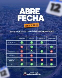 De acordo com o decreto 7.021, de 8 de novembro de 2024, na quinta-feira (19), feriado de Corpus Christi e na sexta-feira (20), ponto facultativo, o expediente está suspenso nas repartições públicas da administração direta do município de Adamantina.