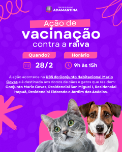 Ainda no sábado (28), acontece mais uma etapa da ação de vacinação antirrábica. Desta vez, a aplicação do imunizante ocorrerá na unidade básica de saúde do Conjunto Habitacional Mario Covas das 9h até às 15h.