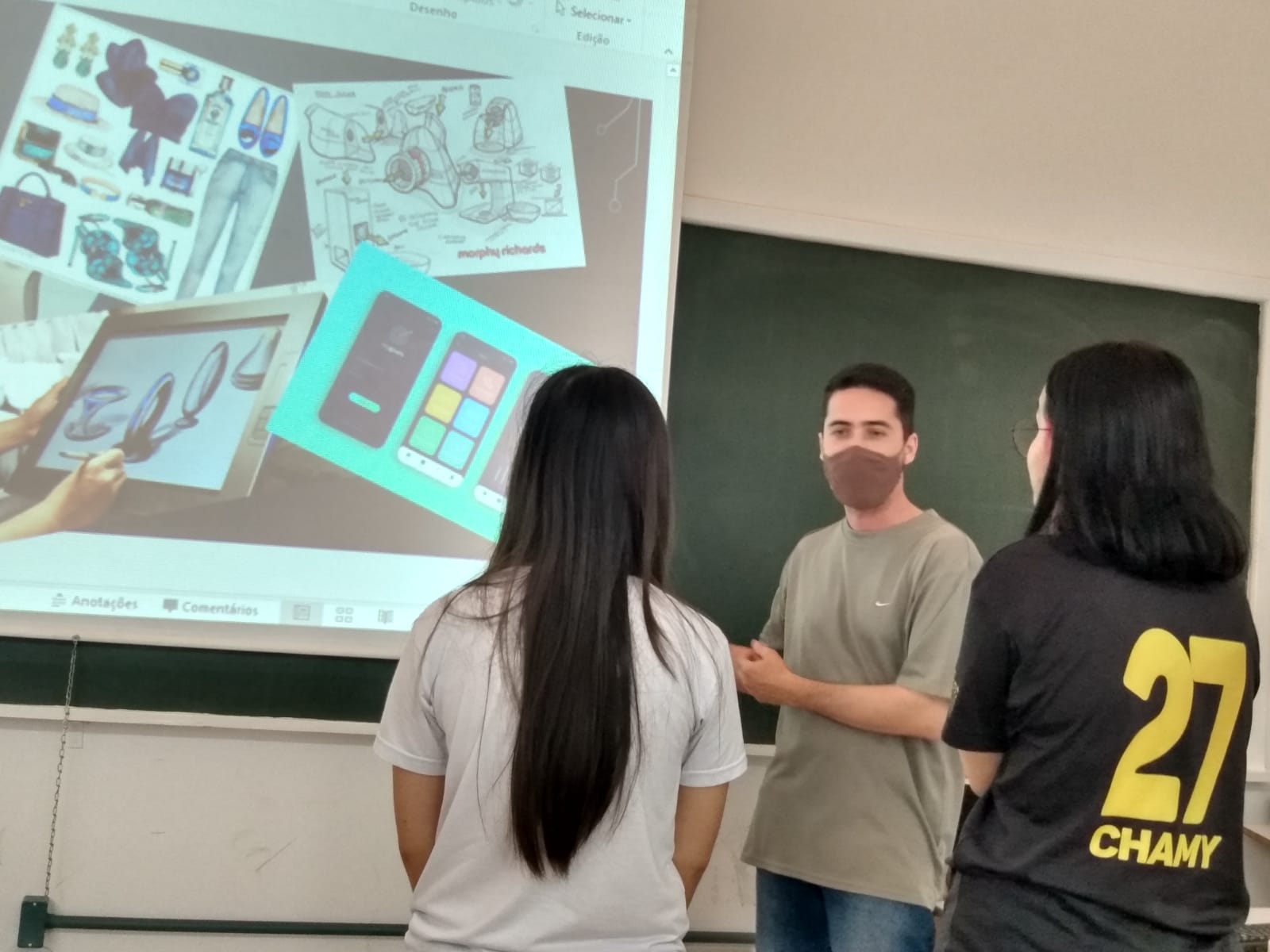 Nathaly Evangelista dos Anjos, aluna do 6º termo de Design, também conversou com os colegiais, respondendo a muitas perguntas e reforçando sua grande apreciação pelo curso e pela variedade de projetos que já participou desde o primeiro semestre de aula. Relatou suas experiências com temas e materiais diferentes, e empolgação com as possibilidades profissionais.