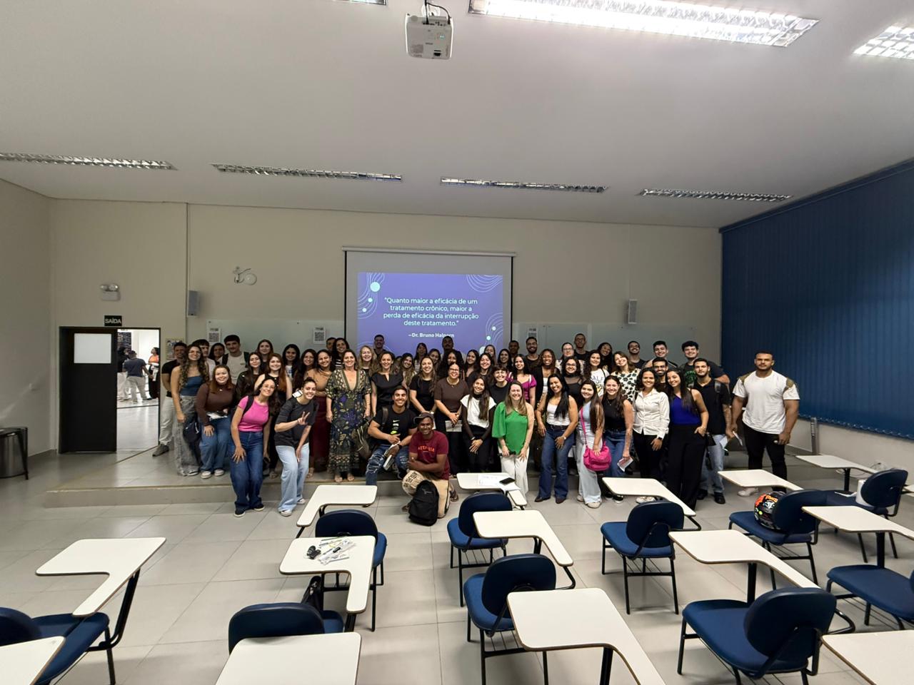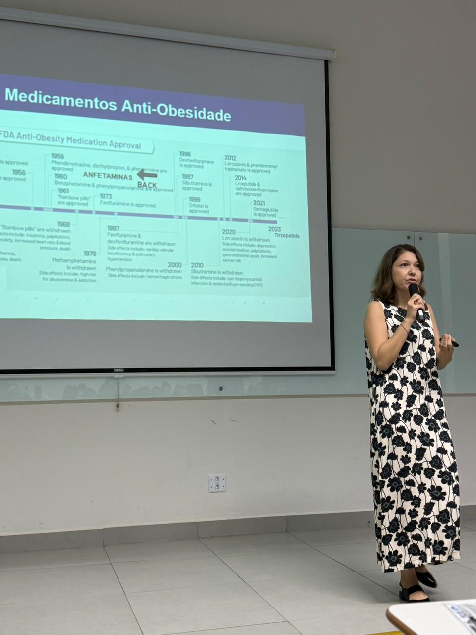 Temas atuais e de grande impacto na saúde pública também pautaram os encontros ao longo do mês. A palestra da Dra. Carolina Castro da Rocha Betônico sobre “Avanços e desafios do tratamento farmacológico na obesidade” atraiu um público amplo, incluindo estudantes de Medicina e Farmácia. O debate esclareceu dúvidas sobre a integração de medicamentos com intervenções nutricionais e de estilo de vida, gerando intensa interação entre os participantes.