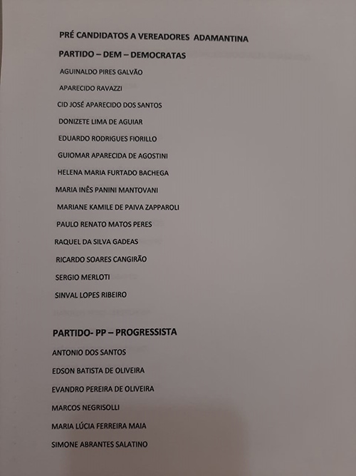 A chapa Trabalho e Amor por Adamantina conta com 38 pré-candidatos, sendo 25 homens e 13 mulheres.