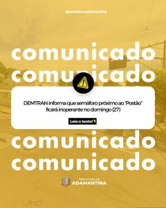DEMTRAN informa que semáforo próximo ao “Postão” ficará inoperante no domingo (27)