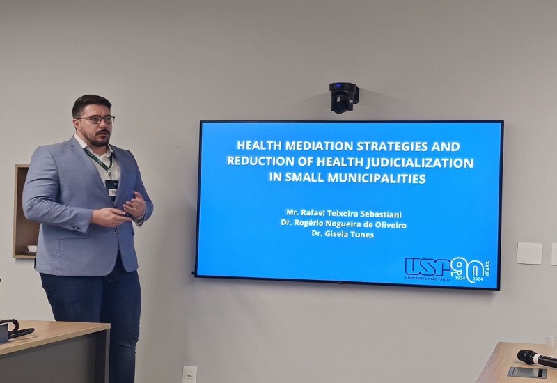 Sebastiani participou com um recorte de sua pesquisa de mestrado, apresentando em inglês no Hall E, o trabalho intitulado “Health mediation strategies and reduction of judicialization of health in small municipalities” (Mediação sanitária e redução da judicialização da saúde em municípios de pequeno porte), que teve a orientação do Prof. Dr. Rogério Nogueira de Oliveira e análise dos dados coletados realizada pela Prof.ª Dra. Gisela Tunes.