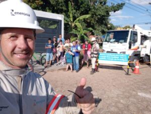 Os profissionais de linha viva – que realizam serviços com a rede elétrica energizada, sem interromper o fornecimento de energia para os moradores da localidade –, faziam uma poda de árvore no bairro Jardim Eldorado, quando foram abordados pela criança. A proatividade dos eletricistas em conversar com o garoto chamou a atenção de quem passava por perto e, aos poucos, outras crianças e até adultos se aproximaram para ouvir as orientações.