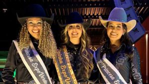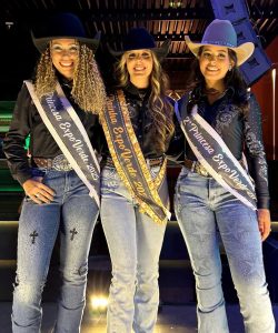 Ao centro a Rainha da ExpoVerde 2025, Maria Laura Bonfim, e as princesas Raphaela Alves de Souza e Sabrina da Silva de Oliveira (Reproducao/ExpoVerde).