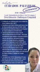 Na quarta-feira (29), a partir das 19h, o grupo de apoio a cuidadores de idosos com demência promove mais um encontro no miniauditório do bloco V da FAI no campus II. Desta vez, a temática será cuidados paliativos nas demências.
