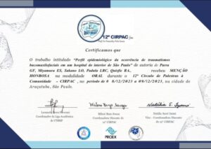 O trabalho intitulado “Perfil epidemiológico da ocorrência de traumatismos bucomaxilofaciais em um hospital do interior de São Paulo” foi apresentado na modalidade oral, em Araçatuba (SP), no 12º Círculo de Palestras à Comunidade (CIRPAC).