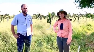 A pequena produtora Vânia Tiveron, de Adamantina, mostra a sua plantação de pitaias – que está sendo preparada para entrar no mercado de exportação – que recebeu o composto produzido no Pátio de Compostagem. Esse cultivo é um desafio, principalmente pelo fato de o clima da região não ser o ideal para essa fruta. Ainda assim, a produtora tem três tipos de pitaias: branca, roxa e amarela.