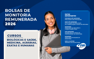 O Centro Universitário de Adamantina (FAI), por meio da Pró-Reitoria de Ensino (PROENS), abriu as inscrições do processo seletivo para o preenchimento de 30 Bolsas de Monitoria remuneradas, destinadas a estudantes regularmente matriculados nos cursos de graduação.