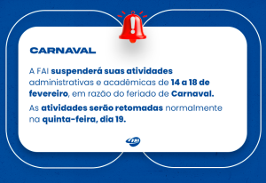 FAI suspende atividades acadêmicas e administrativas durante o feriado de Carnaval