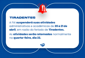 FAI suspende atividades nos dias 20 e 21 de abril devido ao feriado de Tiradentes