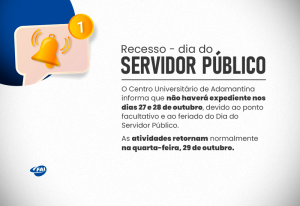 Conforme previsto no Calendário Acadêmico de 2025, o Centro Universitário de Adamantina (FAI) informa que as atividades administrativas e acadêmicas estarão suspensas nos dias 27 e 28 de outubro, em decorrência do ponto facultativo e do feriado do Dia do Servidor Público, celebrado em 28 de outubro.