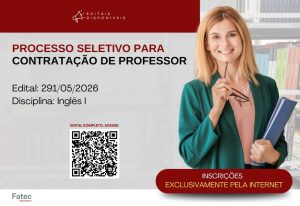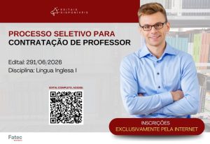 Já o Edital 291/06/2026 trata da disciplina “Língua Inglesa I”, vinculada ao curso de Logística (AMS). As inscrições podem ser feitas pelo link https://tinyurl.com/yw3n3rs4.