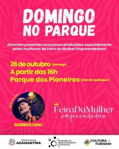 Domingo (26), a partir das 16h acontece mais uma edição do Domingo no Parque. Entre as atrações, estará presente a Feira da Mulher Empreendedora. Cerca de 25 mulheres estarão expondo seus produtos em frente ao espaço gastronômico no Parque dos Pioneiros. Confirmaram presença cerca de 30 mulheres que atuam com artesanato, alimentação, beleza e bem-estar e vestuário.