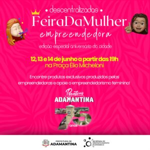 Nesta quarta (12), quinta (13) e sexta-feira (14), a partir das 19h, a Praça Elio Micheloni recebe a Feira da Mulher Empreendedora Descentralizada. A programação integra as comemorações pelos 75 anos de Adamantina.