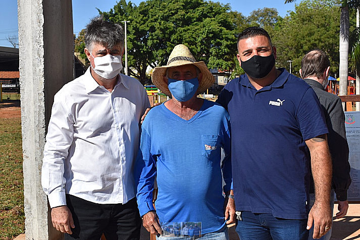 Foto 1 – Prefeito Márcio Cardim, José Quiterio Guiera, funcionário que recebeu a homenagem em nome de todos os servidores da Prefeitura e o secretário de obras, Wellington Zerbini