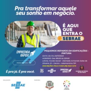 A Prefeitura de Adamantina, por meio do Fundo Social de Solidariedade, em parceria com o Sebrae e Senai, está com inscrições abertas a partir de hoje (31) até a próxima segunda-feira (6) para o curso pequenos reparos em edificações – pintura.