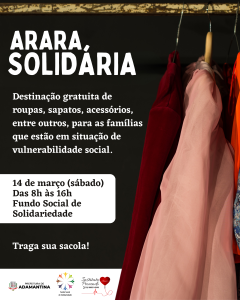 Sábado (14), das 8h até às 16h acontece mais uma edição da “Arara Solidária”. A realização é da Prefeitura de Adamantina, por meio do Fundo Social de Solidariedade, em parceria com o Instituto Provendo Amor.