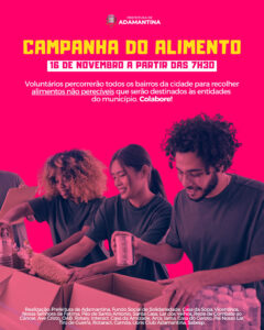 A Prefeitura de Adamantina, por meio do Fundo Social de Solidariedade, realizará no dia 16 de novembro durante todo o dia mais uma edição da Campanha do Alimento.