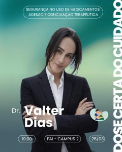 A condução será realizada pelo Prof. Dr. Valter Dias, farmacêutico, mestre e doutor em Fisiopatologia pela Universidade do Oeste Paulista (UNOESTE), com experiência em farmácia clínica, farmacoterapia e fisiopatologia.