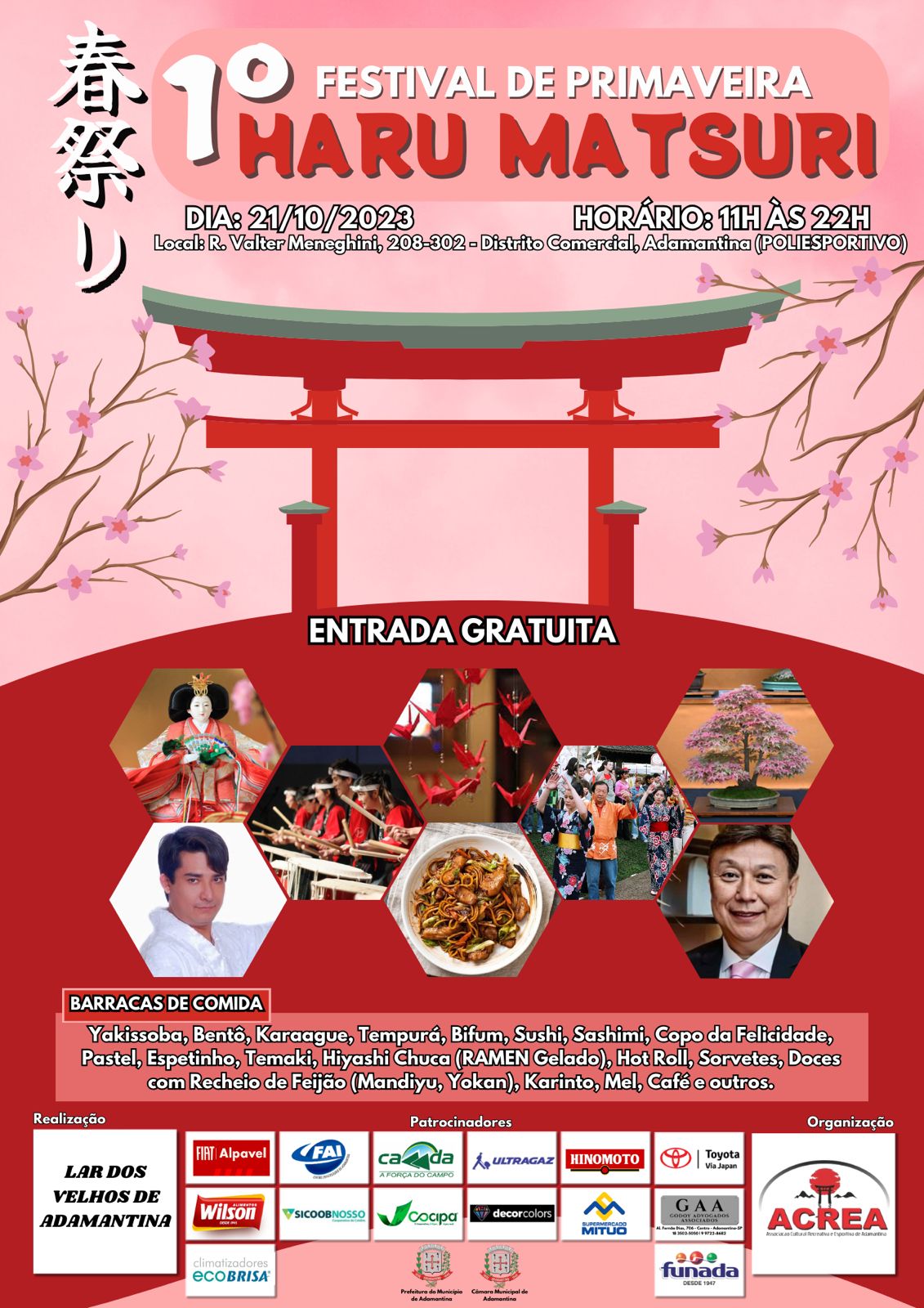 A ACREA , convida associados, familiares e amigos a participar do 1o Festival HARU MATSURI , que será vrealizado no dia 21/10/2023 ( Sábado ) , das 11 às 22 h. no Recinto Poliesportivo .