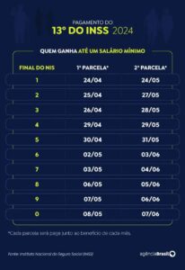 O pagamento do décimo terceiro a quem ganha um salário mínimo começou no último dia 24 e também vai até o dia 8. Até o fim desta semana, mais de 33,6 milhões de segurados receberão a primeira parcela, ao somar os que ganham o benefício mínimo e os que recebem acima dele.