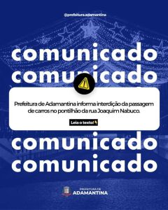 A Prefeitura de Adamantina, por meio da Secretaria de Planejamento, informa que em virtude do início das obras no pontilhão da rua Joaquim Nabuco que consiste na retirada das placas que estão no local, tráfego de veículos estará interditado até quinta-feira (11) das 13h até às 16h.