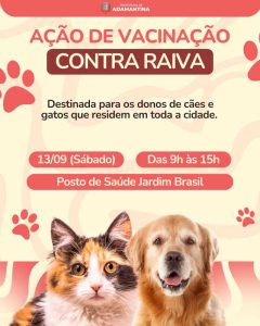 Sábado (13), das 9h às 15h acontece mais uma etapa da ação de vacinação antirrábica na unidade básica de saúde do Jardim Brasil. A ação é destinada para os donos de cães e gatos que residem em toda a cidade.