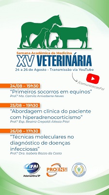 Nas próximas terça a quinta-feira, 24 a 26 de agosto, terá início a XV Semana Acadêmica de Medicina Veterinária do Centro Universitário de Adamantina (UniFAI) pelos canais do YouTube e Facebook (Unifai Adamantina).