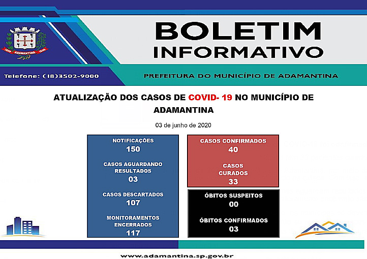 A Prefeitura de Adamantina, por meio da Secretaria de Saúde, informa que na tarde de hoje (3) nenhum novo caso de COVID- 19 foi confirmado na cidade. Com isso, a cidade segue com 40 positivos e 33 curados.