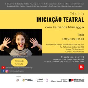 Uma oficina de Iniciação Teatral, com Fernanda Missiaggia, está programada para o dia 19 de agosto, das 9h às 12h e das 13h30 às 16h30, na Biblioteca Municipal. As inscrições estão abertas até o dia 11 de agosto, com vagas limitadas.