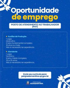 PAT conta com duas oportunidades de emprego uma para auxiliar de produção e outra para atendente