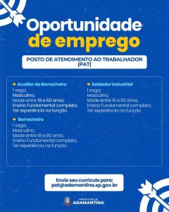 Os interessados em concorrer a uma das oportunidades devem enviar os currículos para o e-mail: [email protected] ou entregar diretamente no Posto de Atendimento ao Trabalhador que funciona no prédio do Poupatempo de segunda a sexta das 9h até às 16h e está situado na Avenida da Saudade – nº 1072 – Vila Endo.