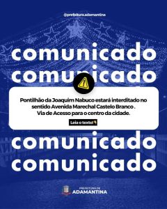 A Prefeitura de Adamantina, por meio da Secretaria de Planejamento, informa que em virtude das obras no Pontilhão da Joaquim Nabuco, o trânsito estará impedido de quarta-feira (3), até o dia 10 de dezembro para circulação no local para motoristas que trafegam na Avenida Marechal Castelo Branco – Via de Acesso sentido centro. Sendo assim, os motoristas deverão utilizar o “pontilhão” da Rua Osvaldo Cruz.