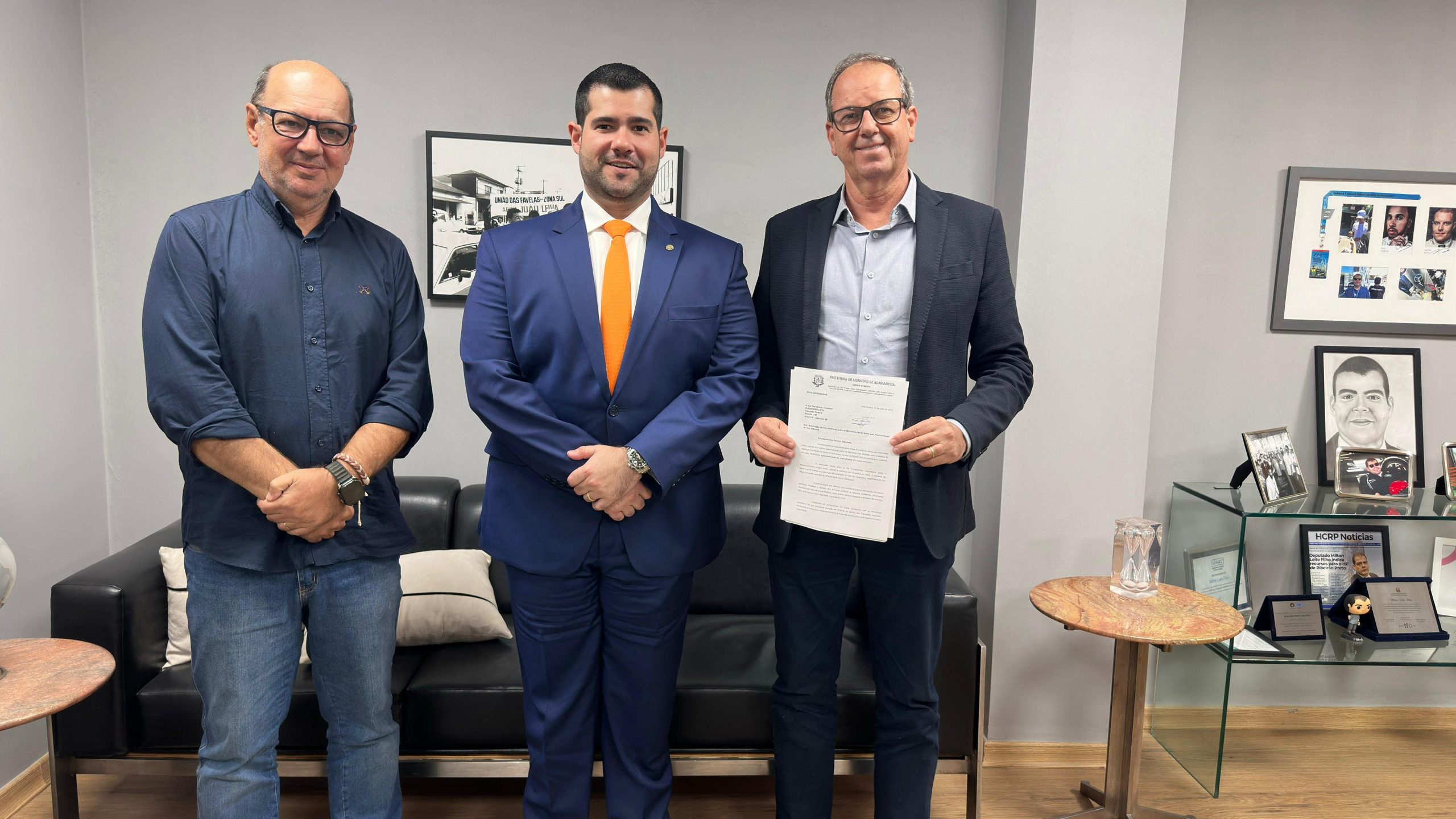 foto 5 – (15/07/2025) entrega da solicitação de recursos ; André Crepaldi – assessor parlamentar, Alexandre Leite deputado federal e José Carlos Martins Tiveron prefeito de Adamantina