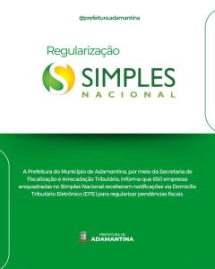 A Prefeitura do Município de Adamantina, por meio da Secretaria de Fiscalização e Arrecadação Tributária, informa que 650 empresas enquadradas no Simples Nacional receberam notificações via Domicílio Tributário Eletrônico (DTE) para regularizar pendências fiscais.