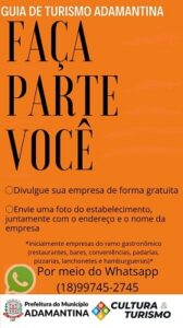 A Prefeitura de Adamantina, por meio da Secretaria de Cultura e Turismo, realizará o lançamento do Guia de Turismo de Adamantina no dia 16 de maio, dentro da programação do Aniversário da Cidade.