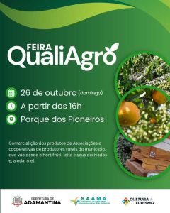 A SAAMA fará a 2ª edição da Feira QualiAgro que consiste em possibilitar que as associações e cooperativas de produtores rurais do município comercializem os seus produtos que vão desde o hortifrúti, leite e seus derivados e, ainda, mel. Atualmente, a pasta conta com 240 agricultores que integram o programa desenvolvido pela Prefeitura de Adamantina que consiste na disponibilização do composto orgânico.