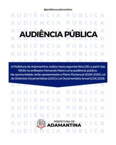 A Prefeitura de Adamantina, em atendimento ao artigo 48, parágrafo único, da Lei Complementar nº 101/2000 – Lei de Responsabilidade Fiscal, realiza nesta segunda-feira (29), a partir das 19h30 no anfiteatro Fernando Paloni uma audiência pública.