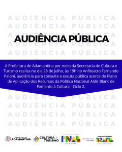 A Prefeitura de Adamantina, por meio da Secretaria de Cultura, realiza nesta segunda-feira (28), a partir das 19h no anfiteatro Fernando Paloni audiência para consulta e escuta pública acerca do Plano de Aplicação dos Recursos da Política Nacional Aldir Blanc de Fomento à Cultura – Ciclo 2.