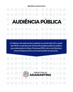 A Prefeitura de Adamantina realiza nesta quinta-feira (31), às 19h30 no plenário da Câmara Municipal audiência pública para elaboração do Plano Plurianual (PPA), da Lei de Diretrizes Orçamentárias (LDO) e da Lei Orçamentária Anual (LOA).