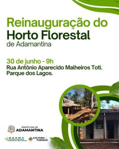 Segunda-feira (30), a partir das 9h, a Prefeitura de Adamantina realizará a reinauguração do horto florestal que está localizado na rua Antônio Aparecido Malheiros Toti, no bairro Parque dos Lagos.