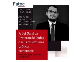 Prof. Me. José Eduardo Lourencini falará sobre “A lei geral de proteção de dados e seus reflexos nas práticas comerciais” nesta sexta, 30; evento será transmitido pelo canal do palestrante no YouTube