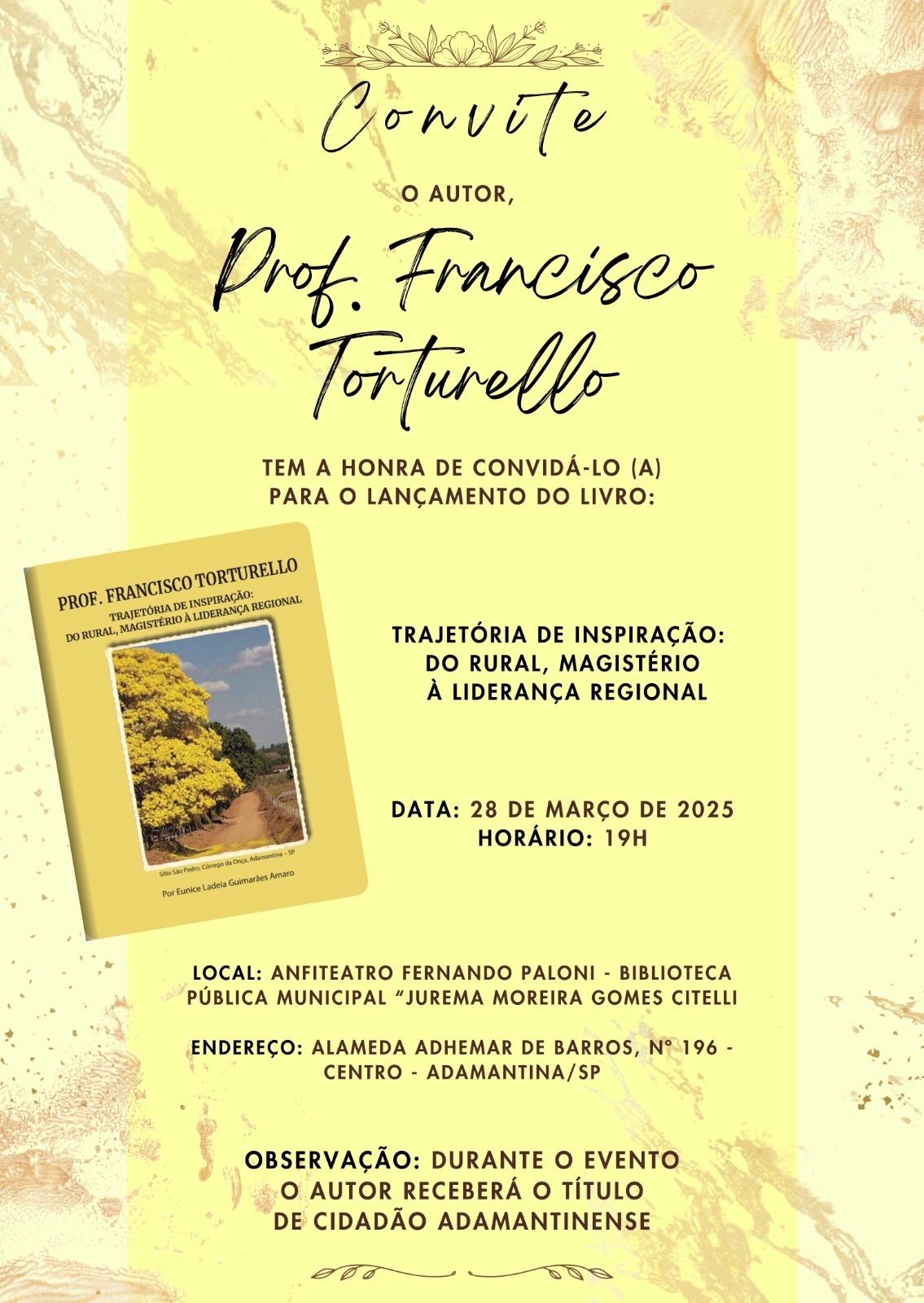 No mesmo evento, após a entrega do Título de Cidadão Adamantinente, o Professor Francisco Torturello fez o lançamento do livro autobiográfico “Trajetória de Inspiração: Do Rural, Magistério à Liderança Regional.