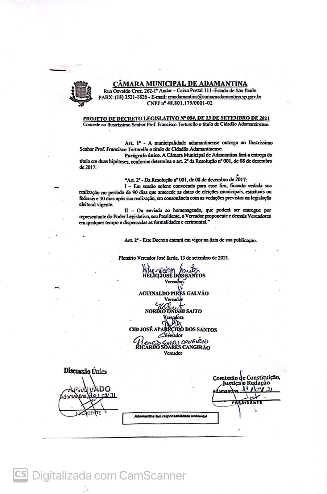 O Título de Cidadão que lhe foi conferido pela Câmara Municipal de Adamantina foi de autoria dos vereadores Hélio José dos Santos, Aguinaldo Galvão, Cid Santos, Noriko Onishi Saito e Riquinha do Bar, sendo aprovado por unanimidade na Legislatura 2021/2024.