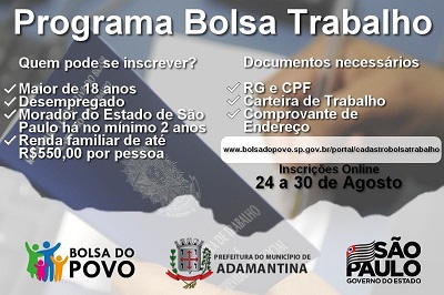 Adamantina foi contemplada com 40 vagas com o Programa Bolsa Trabalho, iniciativa do Governo do Estado de São Paulo que consiste na destinação de bolsas para a população desempregada. As inscrições seguem abertas até o próximo dia 30 de agosto.