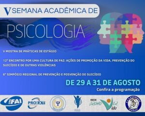 O Curso de Psicologia do Centro Universitário de Adamantina (UniFAI) e a Rede Promover Vida convidam para a V Semana Acadêmica de Psicologia, V Mostra de Práticas de Estágio, 12º Encontro por uma Cultura de Paz: ações de promoção da vida, prevenção do suicídio e de outras violências e 6º Simpósio Regional de Prevenção e Posvenção do Suicídio, que ocorrerão desta segunda-feira, 29, até quarta-feira, 31 de agosto.