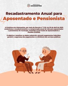 A partir de segunda-feira (2) tem início o período para que aposentados e pensionistas, da Prefeitura de Adamantina nascidos em janeiro, fevereiro e março efetuem o recadastramento e a comprovação anual de vida. O prazo segue até 31 de julho.