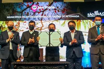 Foto: O secretário da Educação, Rossieli Soares, o vice-governador, Rodrigo Garcia, o governador João Doria, o secretário de Turismo e Viagens, Vinicius Lummertz, e presidente da Associação dos Municípios de Interesse Turístico do Estado de SP (Amitesp), Murilo Pinheiro Ramos.